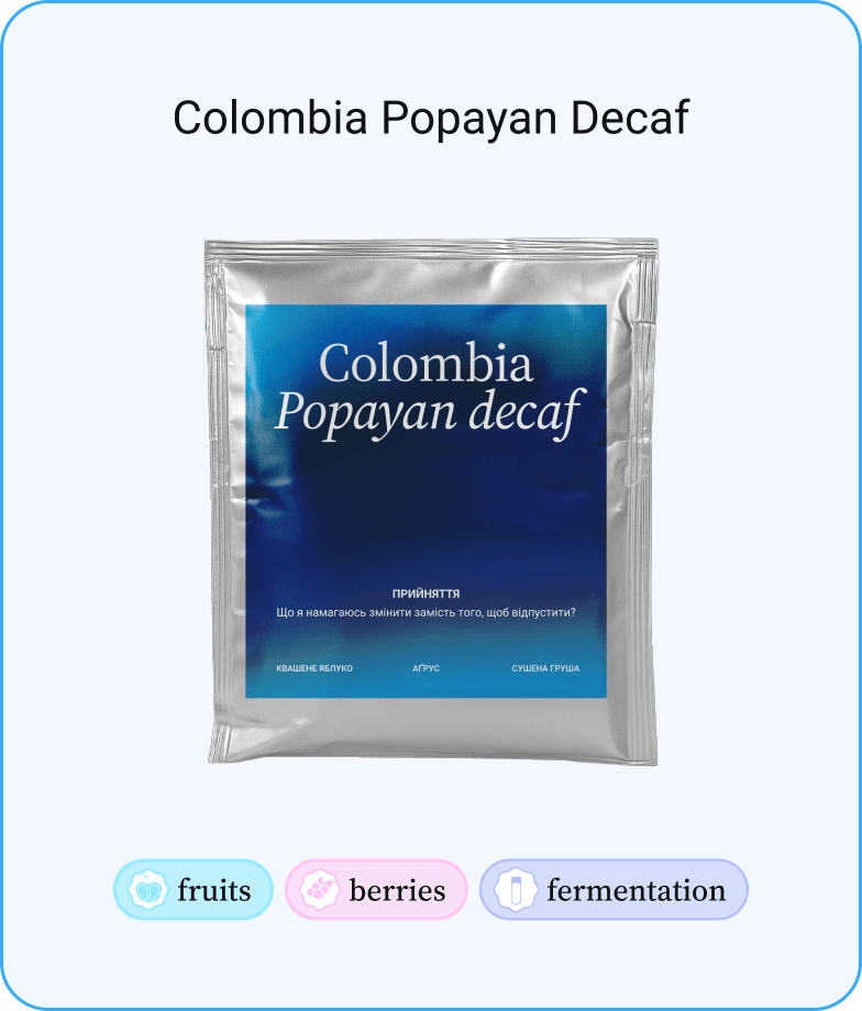 • Colombia Popayan Decaf — квашене яблуко, аґрус, сушена груша